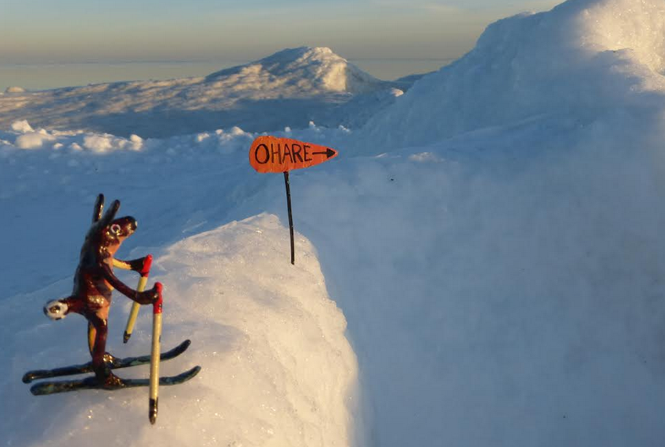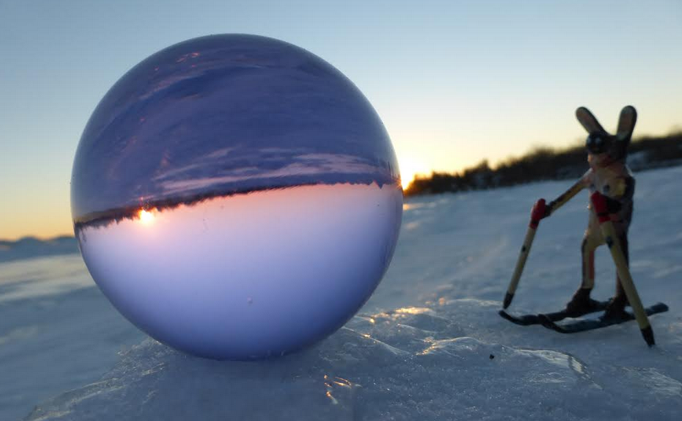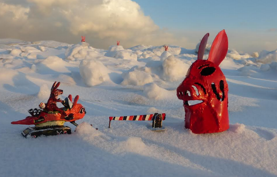 It was a crazy cold winter last year as we know. So it was partly just a thing to get me outside and also something to make up a story about my little sculptures. The ice formations down by the lake were fantastic and the late afternoon light was very beautiful. I thought a little skiing bunny, Bunnski, would be a great little beast to put out on the ice landscapes and by putting the camera really close, everything looked monumental. The story developed with Bunnski’s snowmobile and other creatures he met along the way to Albunnia, his homeland.